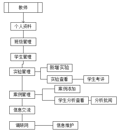 教師端(duan)系(xi)統由班級管理(li)、學生管理(li)、實驗管理(li)、案(an)例(li)管理(li)、調研網管理(li)、信息交流、信息提(ti)示、郵(you)件(jian)管理(li)、在線作(zuo)業、教師信息十個功能模塊(kuai)組成。